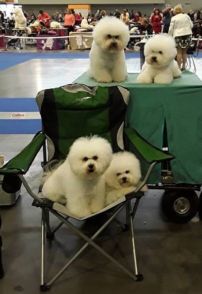 MVP Brno - výstavy se zúčastnila celá bišoní rodinka. Nahoře Honzík - leží - a jeho babička Emilka. Dole sedící je Honzíkova maminka a vedle teta-vychovatelka Helmi. Honzík si vedl skvělě. Dostal známku výborná 2.